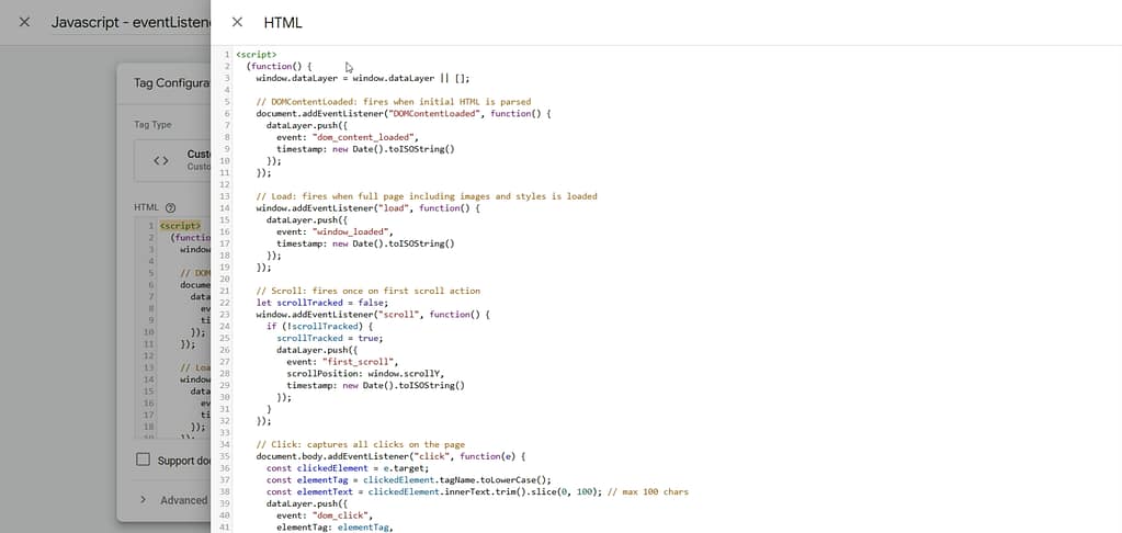 Using JavaScript’s addEventListener function, you can capture event data and push it to the dataLayer for use in other GTM tags. Some examples include: